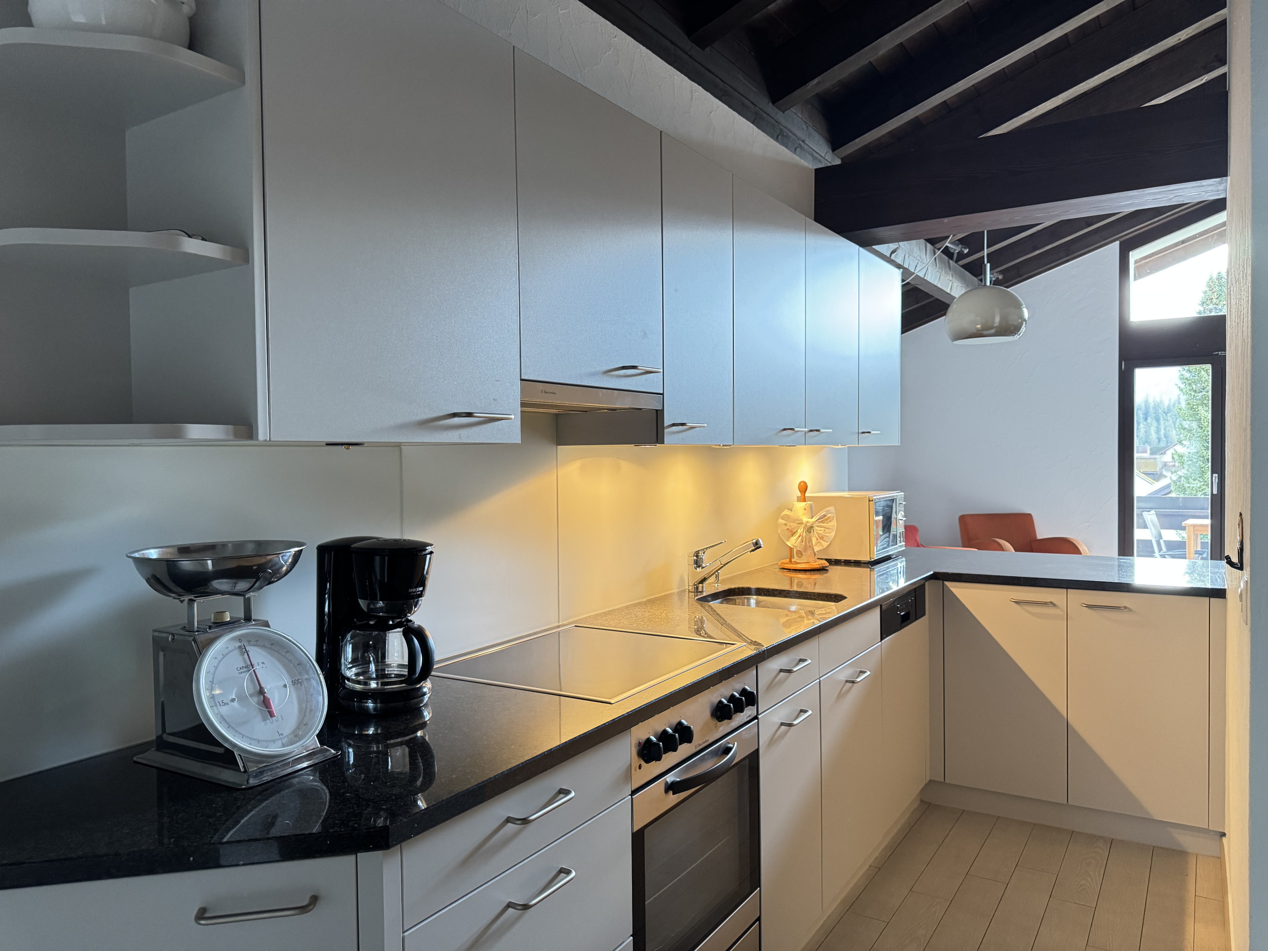On the sunny south-facing balcony, you can enjoy beautiful views of the surrounding mountains. The indoor swimming pool in the building is directly accessible through the underground garage, and a sauna is available for a small fee (coin-operated). A reserved parking space in the underground garage is also included.