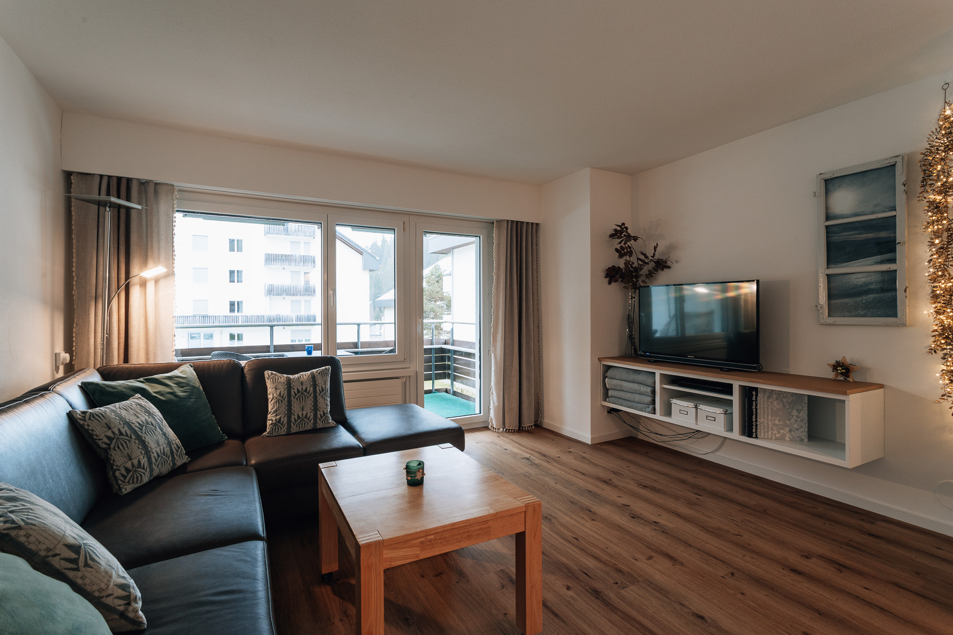 Modern 2.5-room apartment at Residenz Cuolm Liung in Laax Murschetg. The apartment is located in the immediate vicinity of the ski slope and impresses with its quiet yet central location - ideal for starting the day directly on skis or while hiking. The bedroom is equipped with a comfortable queen-size bed, and the living area offers a sofa bed for additional overnight accommodation. The open, fully equipped kitchen is directly connected to the bright living and dining area. The apartment has a bathroom with a shower.