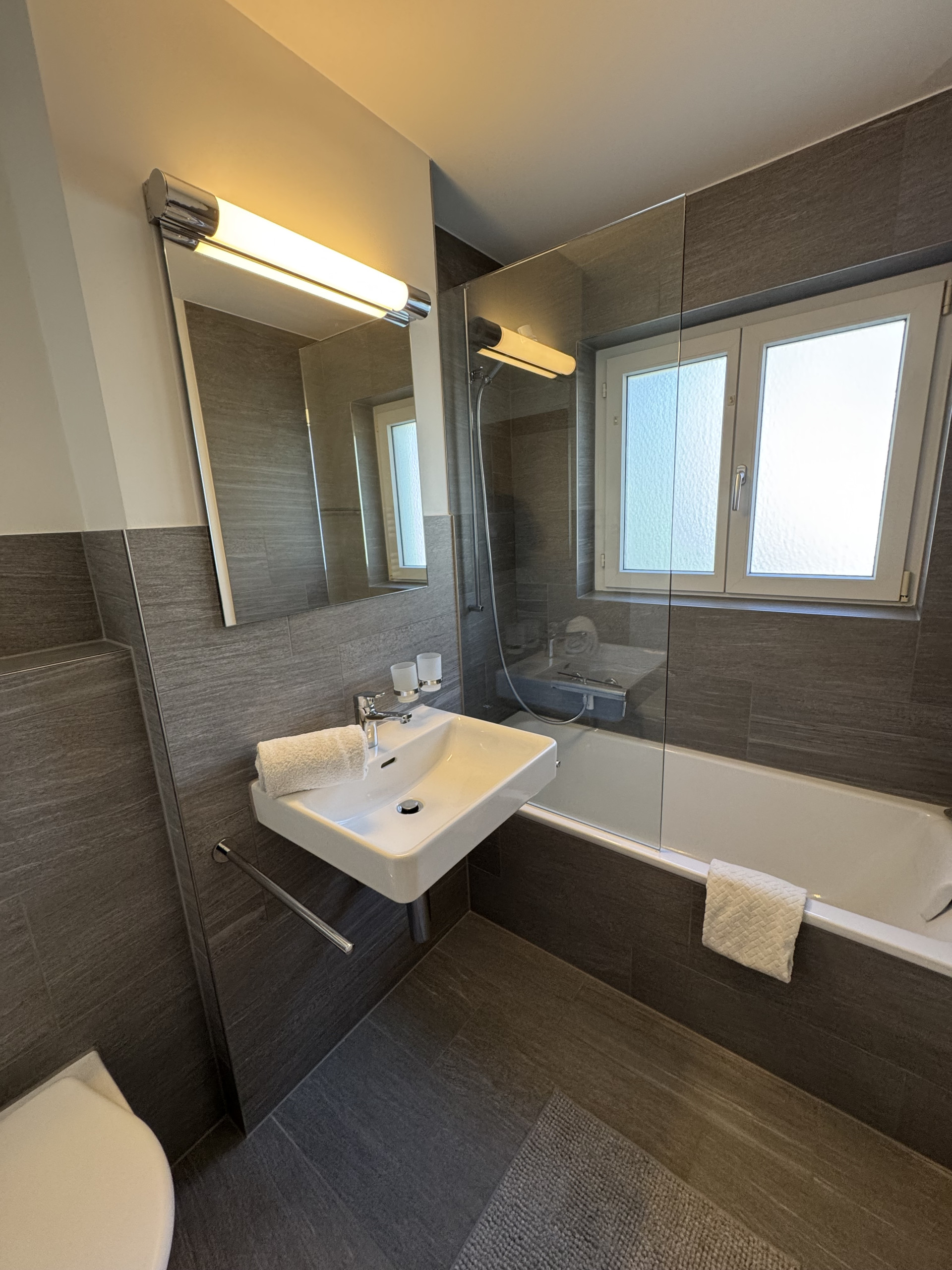 The renovated 2.5-room apartment is ideal for a family with two children. The bedroom features a double bed as well as a bunk bed. The bright living room provides ample space to relax, enjoy a cozy movie night, or dive into your exciting vacation read. The modern, open kitchen offers all the comforts and is fully equipped. After a day of skiing or hiking, unwind in the rainfall shower of the Valserstone-style bathroom. Additionally, you can enjoy a spacious, sunlit balcony with views of the Grisons mountains throughout the day.