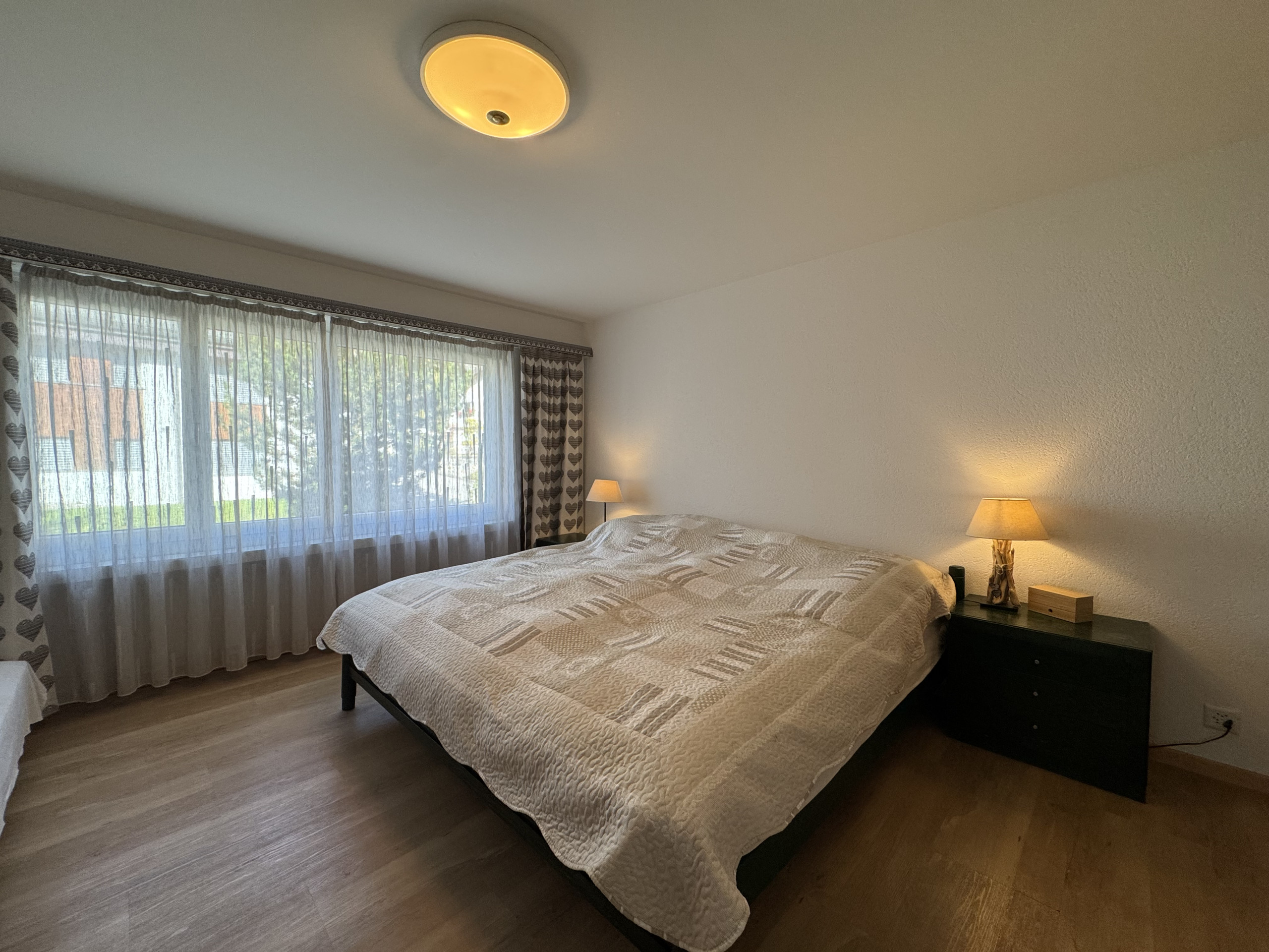 The 3.5-room apartment offers 85 m² of living space, providing plenty of room for up to 4–5 guests – ideal for families. Two bedrooms with comfortable double beds (plus an additional single bed for a child in the master bedroom) ensure restful sleep. The bright living area, furnished with stylish décor, invites you to relax, and the large dining table with corner bench is perfect for shared meals, games, or reflecting on the day together.