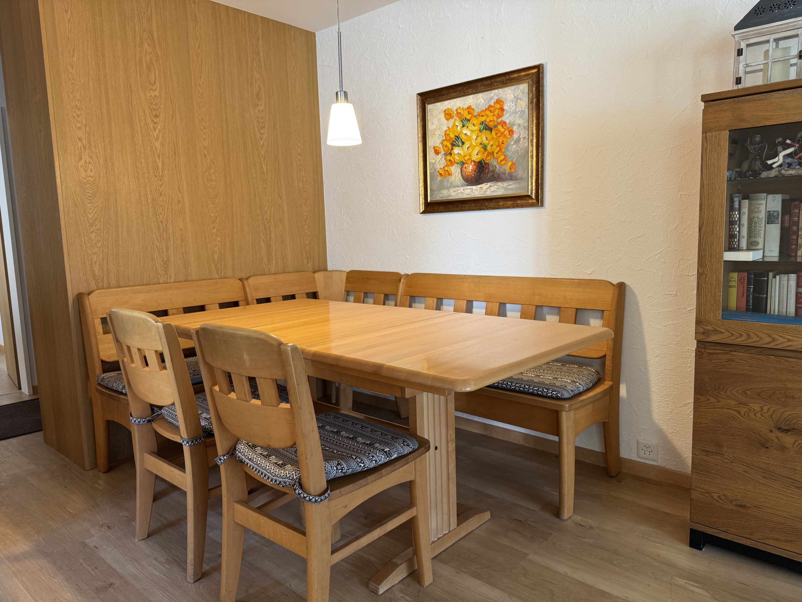 A highlight of the apartment is the south-facing balcony with views of the greenery – perfect for enjoying breakfast in the fresh air or a glass of wine in the evening. For your car, a private garage is available, and there is also a storage room for skis, snowboards, or bikes.