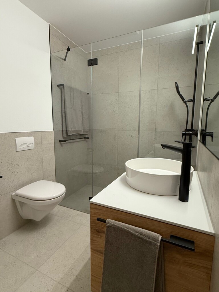 Das moderne Badezimmer verfügt über eine Walk-in-Dusche. Weitere Annehmlichkeiten wie ein praktisches Reduit, ein Kellerraum für Bikes, WLAN, Smart-TV sowie ein Stellplatz in der Garage sorgen für zusätzlichen Komfort.