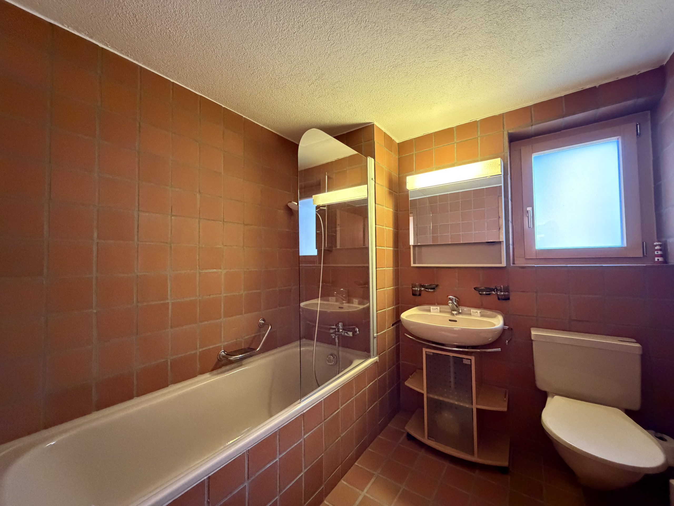 Das Badezimmer ist mit einer Badewanne ausgestattet. Die Wohnung eignet sich ideal für Paare oder kleine Familien, die entspannte Ferientage in Laax verbringen möchten.