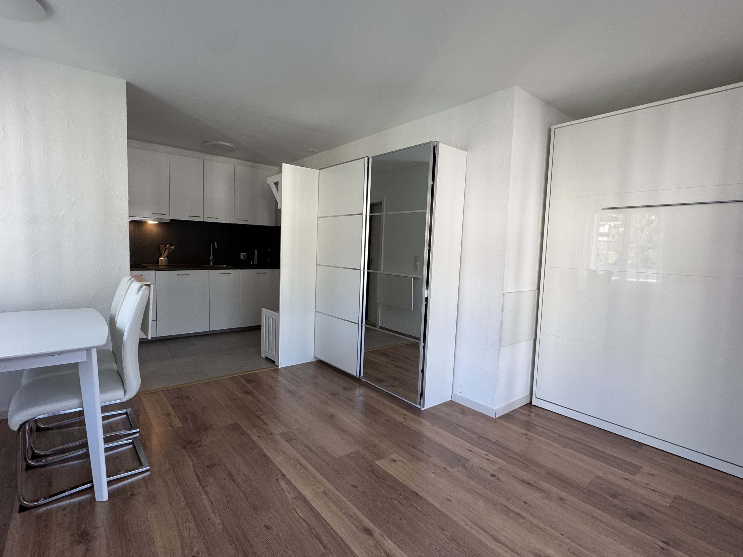 Der kombinierte Wohn- und Schlafbereich verfügt über ein gemütliches Doppelbett, einen Esstisch für bis zu vier Personen sowie einen Fernseher und kostenloses WLAN – perfekt für gemütliche Stunden nach einem aktiven Tag in den Bergen. Die offene Küche ist praktisch ausgestattet: mit Kochfeld, kleinem Kühlschrank mit Gefrierfach, Nespresso-Kaffeemaschine,