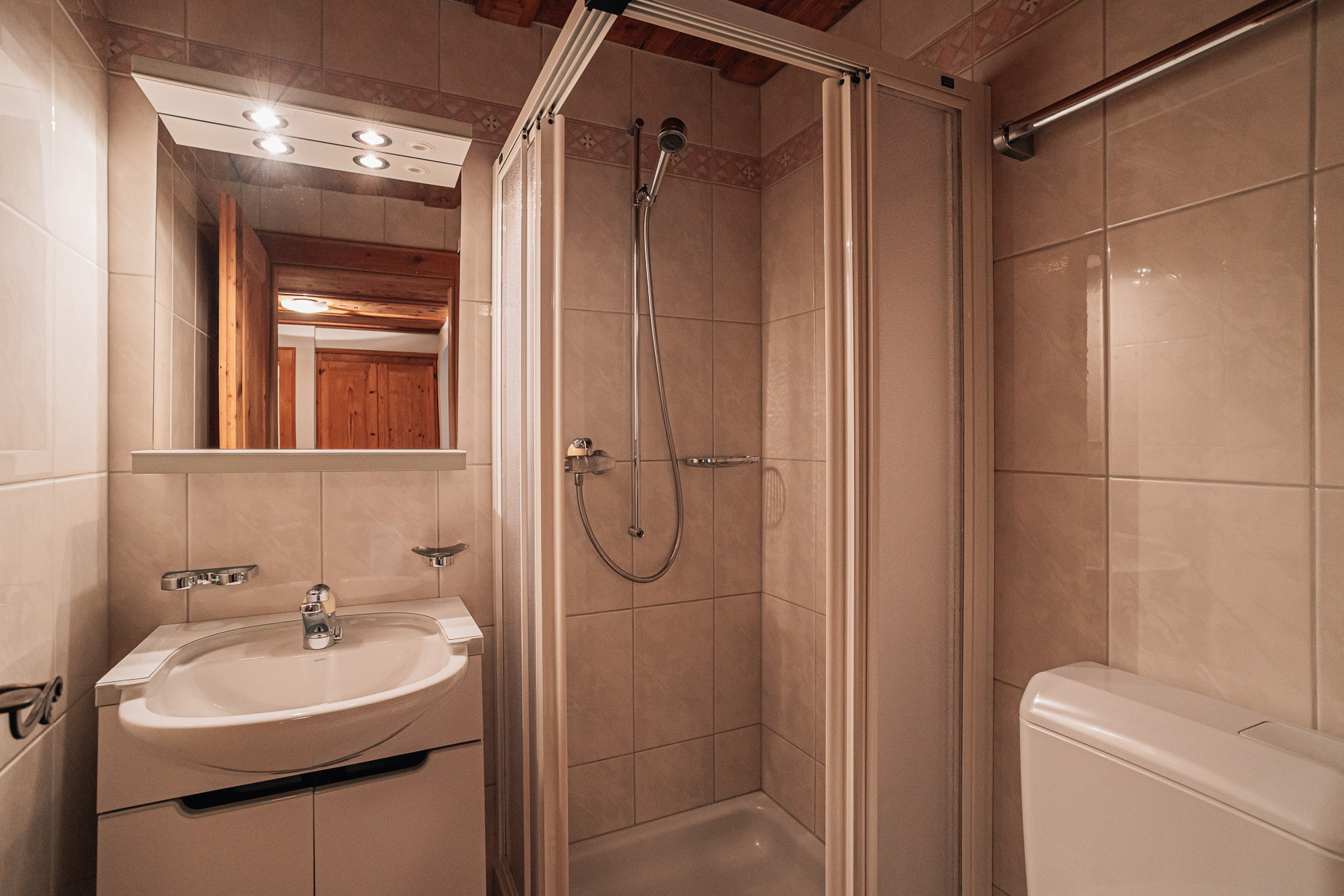 Es gibt zwei Badezimmer: eines mit Lavabo, Badewanne inklusive Dusche und WC, sowie ein weiteres mit Lavabo, Dusche und WC. Zwei sonnige Südbalkone bieten eine herrliche Aussicht auf das Dorf.